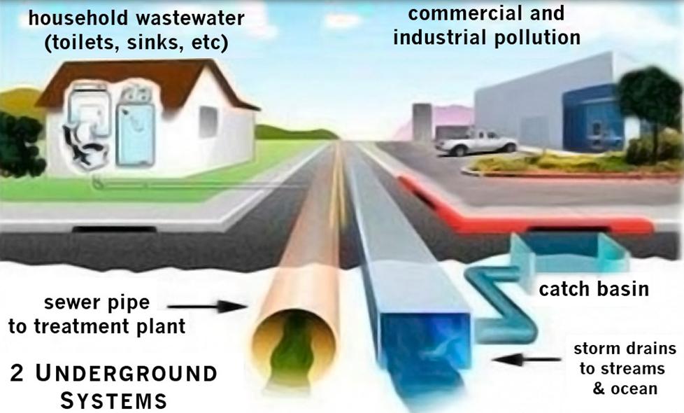 Sanitary sewers drain the pipes connected to your sinks, bathrooms, washing machines, etc. They carry waste to a sewage treatment plant where the water is cleaned and then reused or discharged into the ocean away from beaches.